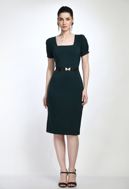 Bottle Green Bodycone Cotton Spandex Dress with Belt