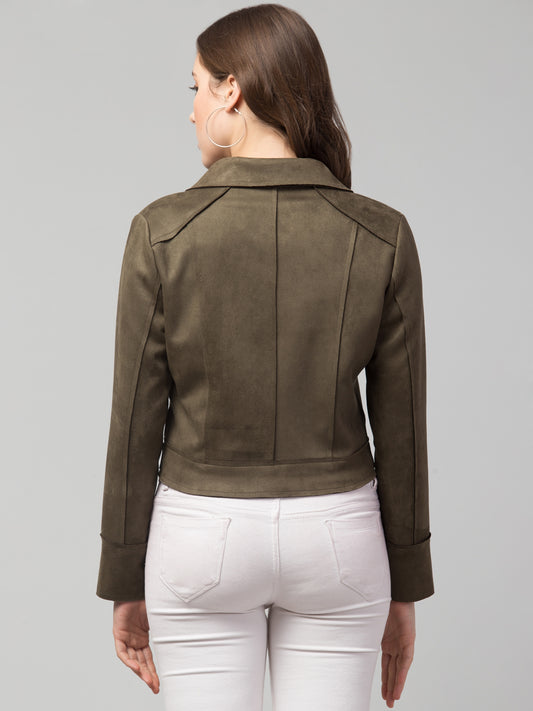 Mehandi Green Color Suede Fabric Girls Short Blazer