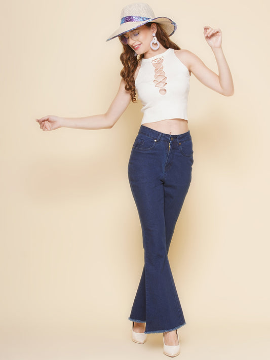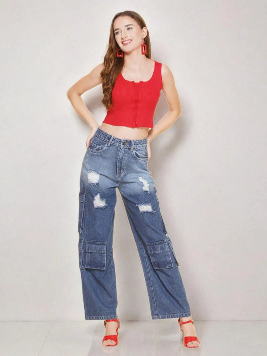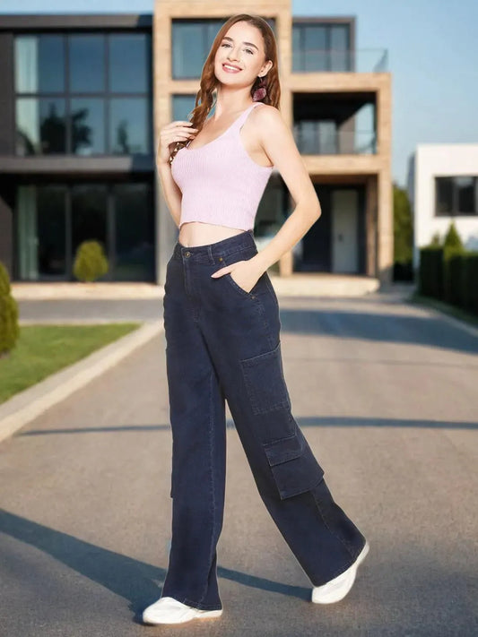 Wide Leg Multi Pocket Cargo Jeans in Blue